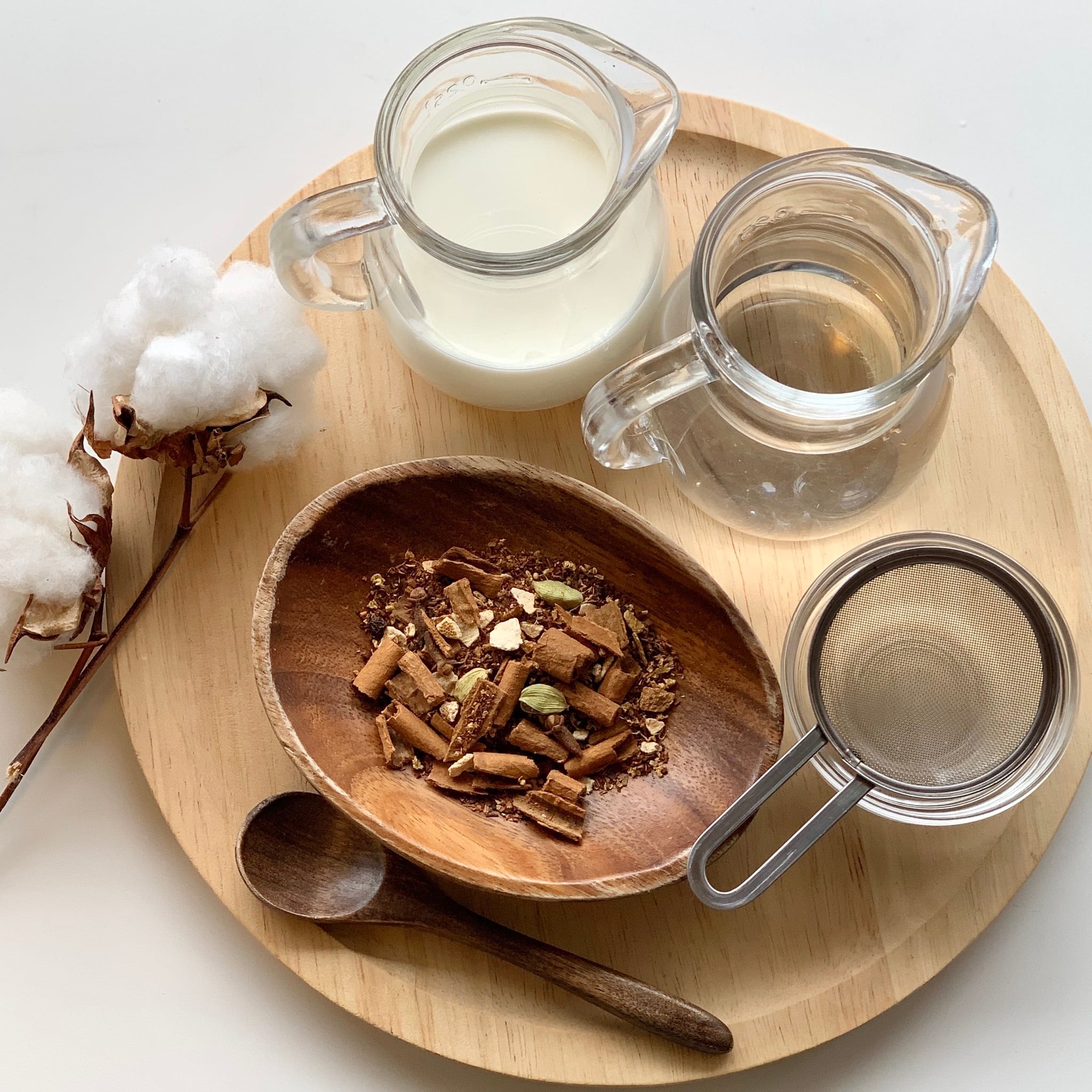 ①小鍋に水100ccとチャイ大さじ2を入れ、弱火で3分間混ぜながらゆっくりと